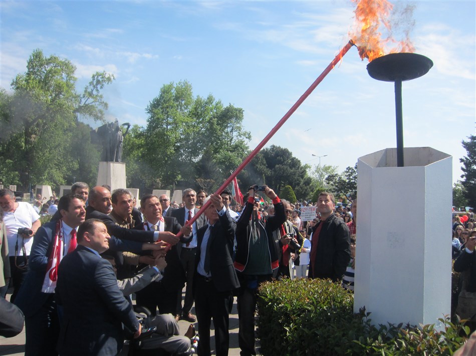 Anıt önüne gelindiğinde, Türk ve Filistin’de hayatlarını yitirenler için saygı duruşunda bulunuldu, İstiklal Marşı ise bir ağızdan söylendi. Anıt girişinde bulunan iki adet meşale, şenliğe katılan protokol üyeleri tarafından yakıldı, ardından da Atatürk Caddesi Amfi Tiyatro’daki etkinliğe geçildi.