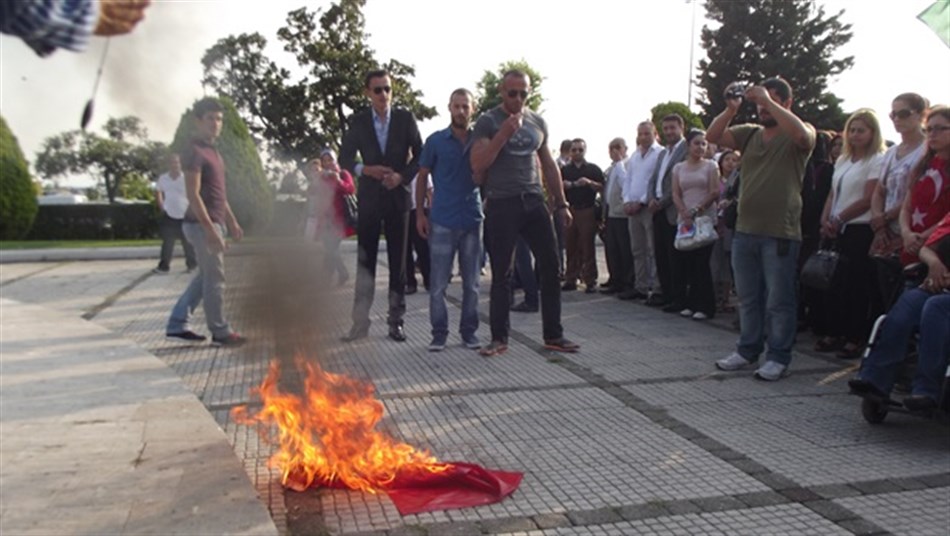 Basın açıklamasının ardından Çin bayrağı yakılırken, bir süre slogan atan grup daha sonra dağıldı.