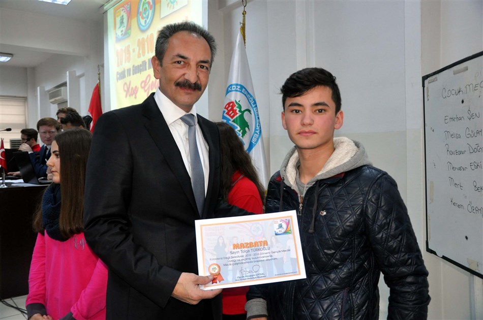Çocuk ve Gençlik Meclisi’nin ilk toplantısında meclis üyeliğine seçilen öğrencilere mazbataları ve Belediye Meclisi Üyeliği rozetleri Başkan Uysal’ın yanı sıra toplantıya katılan, Ereğli Eğitim Fakültesi Dekanı Prof. Dr. Ali Azar, Başkan Yardımcıları İbrahim Cöbek ve Alptekin Dursun, İlçe Milli Eğitim Şube Müdürleri Bahattin Girgin, İsmail Aksoy ve Kdz. Ereğli Belediyesi Sosyal Yardım İşleri Müdür Vekili Baki Kara tarafından takıldı.