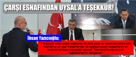 Çarşı içi esnaflarından olan Belediye Meclis Üyesi İhsan Yazıcıoğlu, esnaf arkadaşlarının kendisi aracılığıyla, Belediyenin çarşı içinde yaptığı alt yapı hizmetlerinden dolayı teşekkür ettiğini belirterek; "Müftü Mahallesi, Un Pazarı, Yemeniciler Sokak, Tulumba Sokak ve çarşı merkezi olarak bilinen yerlerde geçmiş yıllarda şiddetli yağışlarda çok mağdur olan esnafımız bu dönemdeki yağışlarda metrekareye çok yoğun düştüğü halde herhangi bir sıkıntıya maruz kalmamıştır, Esnaf arkadaşlarımız Belediye Başkanımız ve gerekli birime teşekkür etmek istedikleri için, arkadaşlarım adına Belediye Başkanımız başta olmak üzere tüm ekibine teşekkür ediyorum “dedi.