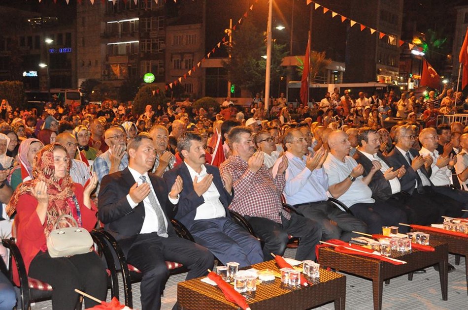 Kuran-ı Kerim tilavetinin ardından şehitler için dua edildi. Birlik ve beraberlik mesajlarının da verildiği alanda, olayların hafızalarda canlanması için darbe girişimi gecesinde yaşananlar sinevizyondan vatandaşlara izletildi.