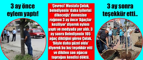 Kdz. Ereğli ilçesi Şehit Astsubay Ömer Halisdemir Bulvarı üzerinde geçtiğimiz Haziran ayında ağaçların sökülmesine engel olmak için iş makinelerinin önünde duran çevreci Mustafa Çolak, bu kez belediye ekipleri ile birlikte aynı bulvar üzerinde ağaç dikimine katıldı. Daha önce ağaçların sökülmesine çok üzüldüğünü ifade eden Çolak, şimdi aynı bölgeye yeniden ağaçların dikilmesinin kendisini memnun ettiğini söyledi. Çolak, Şehit Astsubay Ömer Halisdemir Bulvarı’nda ağaç yoğunluğunun eşit şekilde dağıtıldığını, bu durumunda kendisini mutlu ettiğini belirtti.