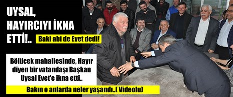 kdz.Ereğli Belediye Başkanı Hüseyin Uysal, Bölücek mahallesindeki referandum çalışmasında hayır diyen bir vatandaşı Evet için ikna etti. İsminin Baki olduğu öğrenilen Bölücek mahallesi sakini, Başkan Hüseyin Uysal'ın referanduma niçin evet demeliyiz açıklamalarından sonra ikna oldu ve 'Senin için evet diyorum' dedi.