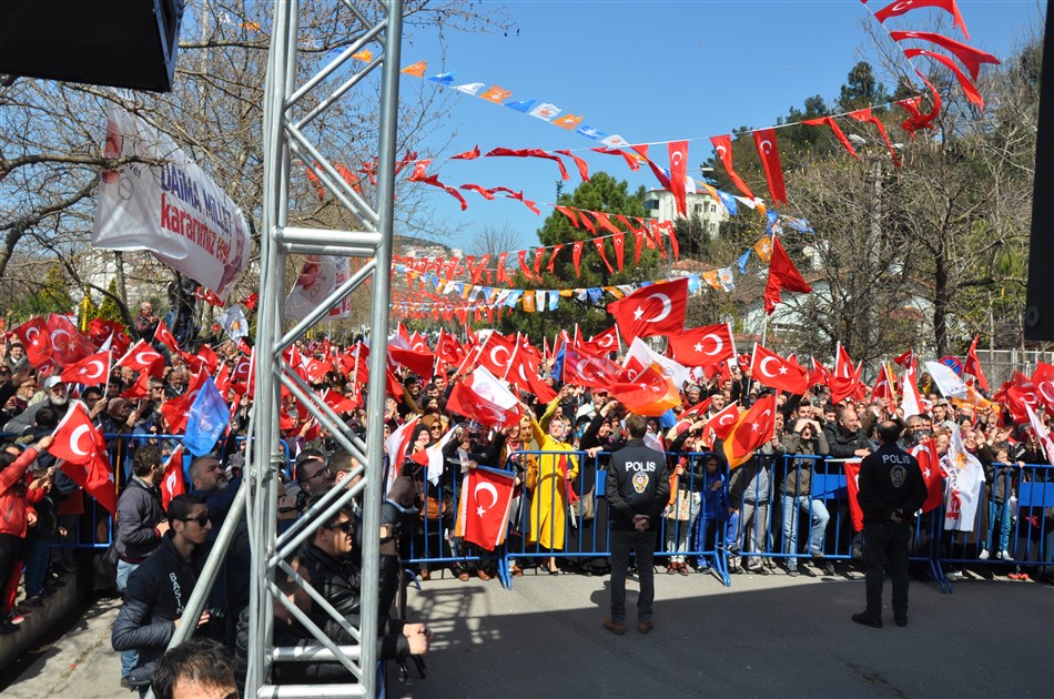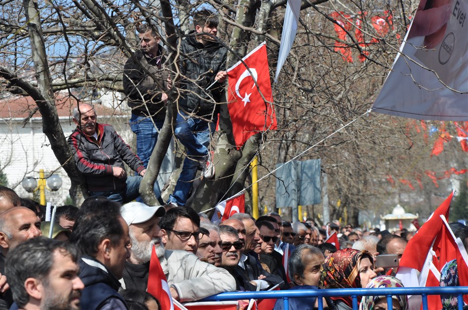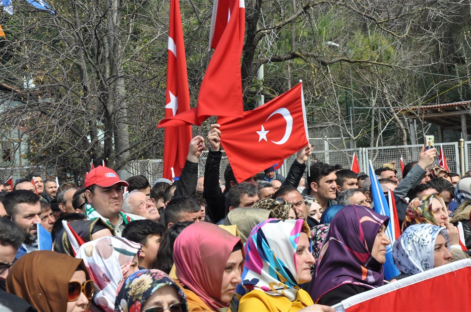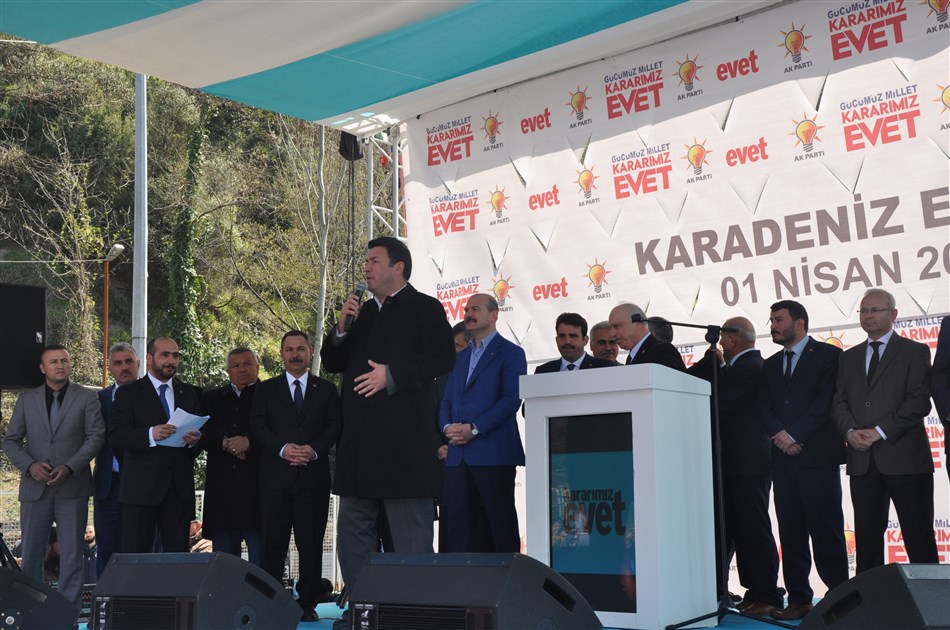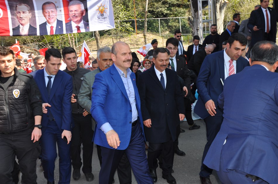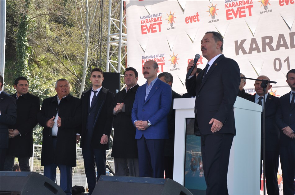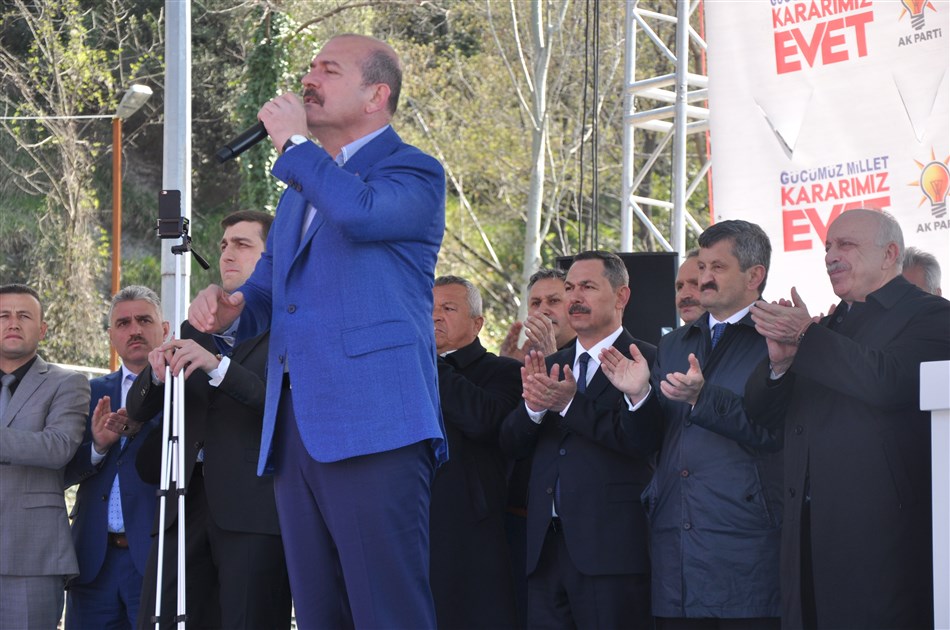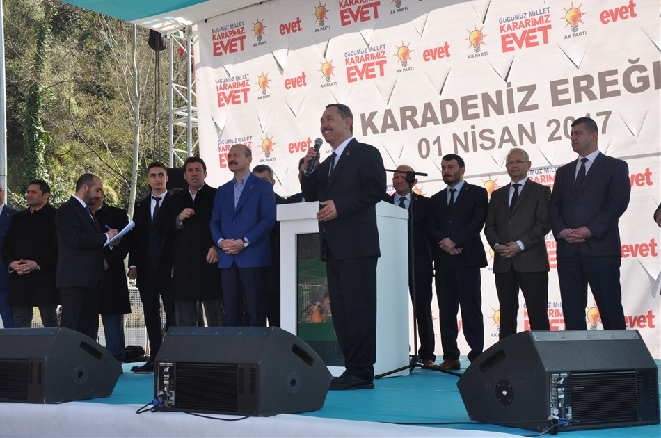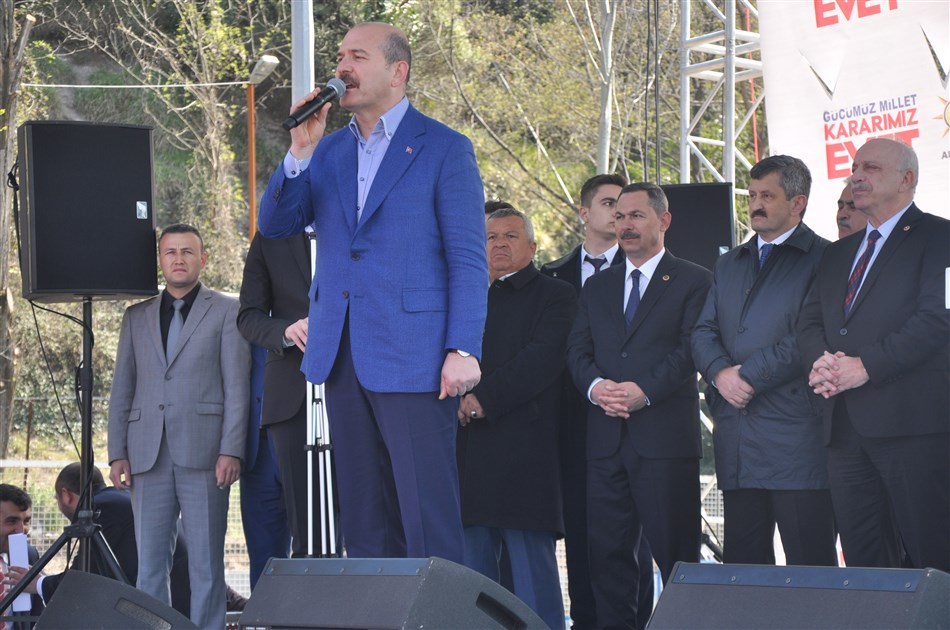 İçişleri Bakanı Süleyman Soylu, partisinin Zonguldak Milletvekilleri Hüseyin Özbakır, Faruk Çaturoğlu ve Özcan Ulupınar ile birlikte Kdz. Ereğli ilçesi Erdemir ofis yolu üzerinde düzenlenen mitinge katıldı. Burada kalabalığa hitap eden Soylu, Türkiye’nin sürekli darbelerle ve terörle terbiye edilmeye çalışılıp ilerlemesinin durdurulmaya çalışıldığını söyledi. Soylu konuşmasında "Bizi terbiye etmeye çalıştılar darbelerle, terörizmle. Bizi anarşizmle, enflasyonla, ekonomik krizlerle, siyasal kaoslarla, kıyafetlerimiz üzerinden, inançlarımız, değerlerimiz üzerinden terbiye etmeye çalıştılar. Kardeşi kardeşe vurdurarak bizi terbiye etmeye çalıştılar. Bizi 1960 darbesi ile bir başbakanımızı asarak terbiye etmeye çalıştılar. ‘Bu ülkeyi size idare ettirmeyeceğiz’ diyerek bizi terbiye etmeye çalıştılar. Oyla iş başına gelen iktidarları ‘İstediğimiz gibi alaşağı ederiz’ diyerek medya baronları ve medya patronları ile bizi terbiye etmeye çalıştılar. 15 Temmuz’da o haninin, o meczubun, o alçağın verdiği talimatlarla bu ülkede F16’larla, helikopterlerle, tanklarla benim ülkemizin masum insanının üzerine kurşun yağdırarak, bu ülkeyi istila etmeye çalışarak bizi terbiye etmeye çalıştılar. ‘Bu ülkeyi istediğiniz gibi yönetemezsiniz, bu coğrafyada size istediğinizi yaptırmayız, millet idaresi nedir?’ diye bizi terbiye etmeye çalıştılar. 16 Nisan sadece 18 maddelik bir referandumun adı değildir. 16 Nisan sadece bir anayasa değişikliğinin adı değildir. Bu memleketin üzerine oynanan oyunlara karşı, bizi terbiye etmeye çalışanlara karşı, bu vatanda bizimdir, bu toprak bizimdir diyen o güçlü sesin adıdır" dedi.