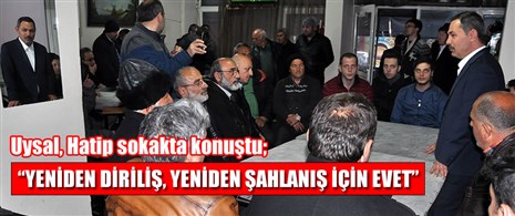 Uysal sözlerini , “Yeniden diriliş, yeniden şahlanış için 16 Nisan’da bir kez daha ayağa kalkıp, ülkemizi bölmek, parçalamak isteyenlere, Türkiye’de kaos isteyenlere karşı birleşerek, güçlü bir Türkiye için Evet’te birleşelim” diyerek noktaladı.