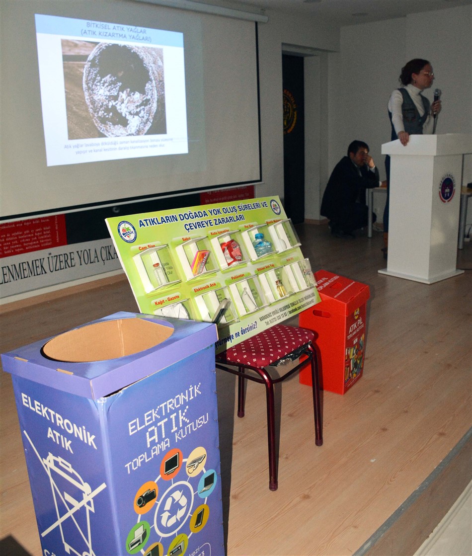 Ereğli İlk Okulu’nda yapılan toplantı ile öğrenciler, bitkisel atık yağlar, atık piller ve elektronik atıklar ve geri dönüşümleri, atık getirme merkezi ve gürültü kirliliği konusunda Temizlik İşleri Müdürlüğü Çevre Mühendisleri İlkay Kaynak ve Koray Sivrikaya tarafından bilgilendirildi.