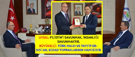 Filistin Ankara Büyükelçisi Dr.Faed Mustafa’nın ziyaretinde konuşan Belediye Başkanı Hüseyin Uysal, her zaman Filistin halkının yanlarında olduklarını belirterek; “Cumhurbaşkanımız Recep Tayyip Erdoğan’ın da dediği gibi, Kudüs bizim kırmızı çizgimizdir. Ve inşallah bir gün Kudüs Filistin’in ebedi başkenti olacaktır. Kudüs’ü savunmak insanlığı savunmaktır” dedi. Büyükelçi Faed Mustafa ise, Kdz.Ereğli ile ilişkileri geliştirmek istediklerini söyledi.