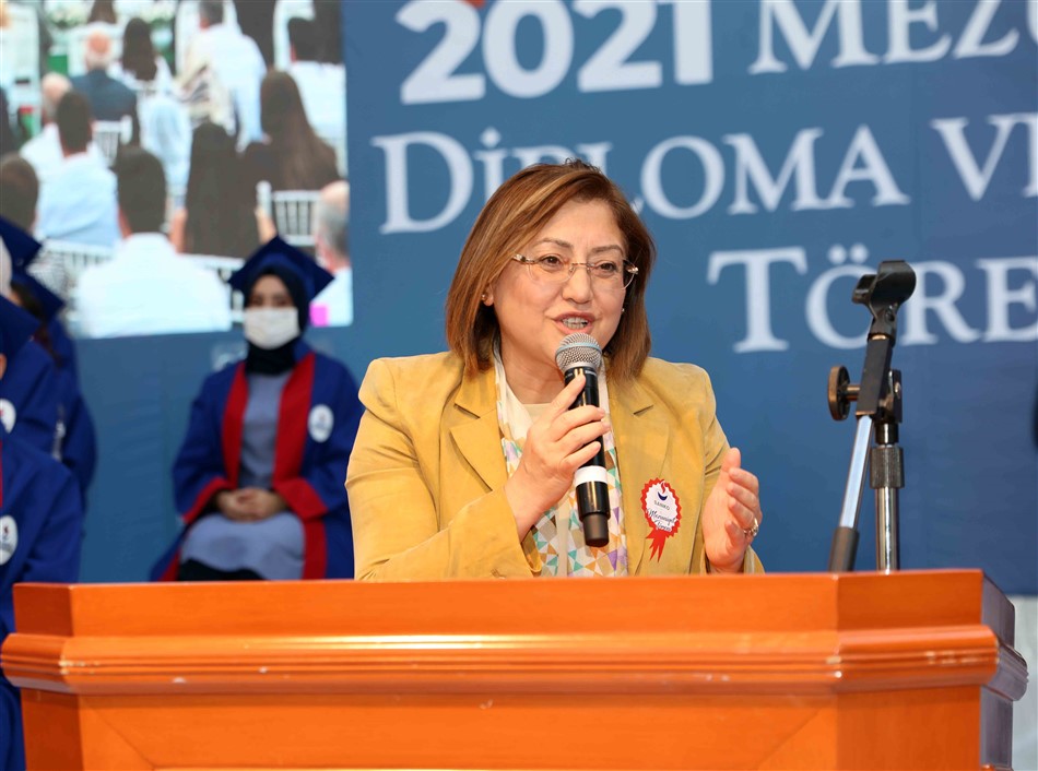 Büyükşehir Belediye Başkanı Fatma Şahin, mezuniyet töreninde yaptığı konuşmada “En büyük gücümüz yetişmiş insan gücümüz. Sizler geleceğin Aziz Hocalarısınız” dedi.