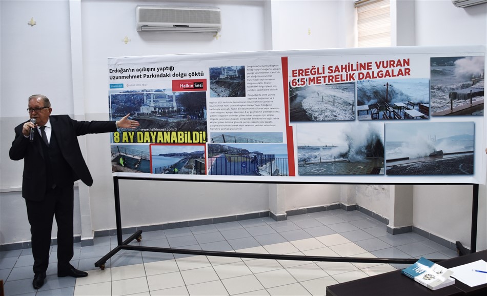 Zaten duyduğumuza göre zemin de çürük çıktı, altlar berbat çıktı. Zonguldak'a cami yapıldı, hayırlı olsun. 8 ay dayandı. Dalga geldiğinde ne kadar dayanacak? Ereğli'de 6,5 metre yüksekliğinde dalga oluşuyor. Böyle bir anlayış olur mu? Kilimli'deki sahil yolunu biliyorsunuz, Cumhurbaşkanımız açılışına gelecekti, ertelendi. Bilim insanları diyor ki her sene deniz 3 milimetre yükseliyor… Ona göre ülkeler tedbir almaya başladı. Karadeniz de dahil buna... İnsanlar buna karşı tedbir alıyor; biz denizin ortasına cami yapmaya çalışıyoruz. Fatih Çakır mı biliyor bunu yoksa bilim insanları mı... Herkes haddini bilsin, siyasetçi siyasetini yapsın, bilim insanları da görevini yapsın. Zeminden çıkanları da gördük, balçık... Ben Ereğli halkına, siyasi partilere de güveniyorum. Buna asla izin vermeyeceğiz, hodri meydan, diyorum."