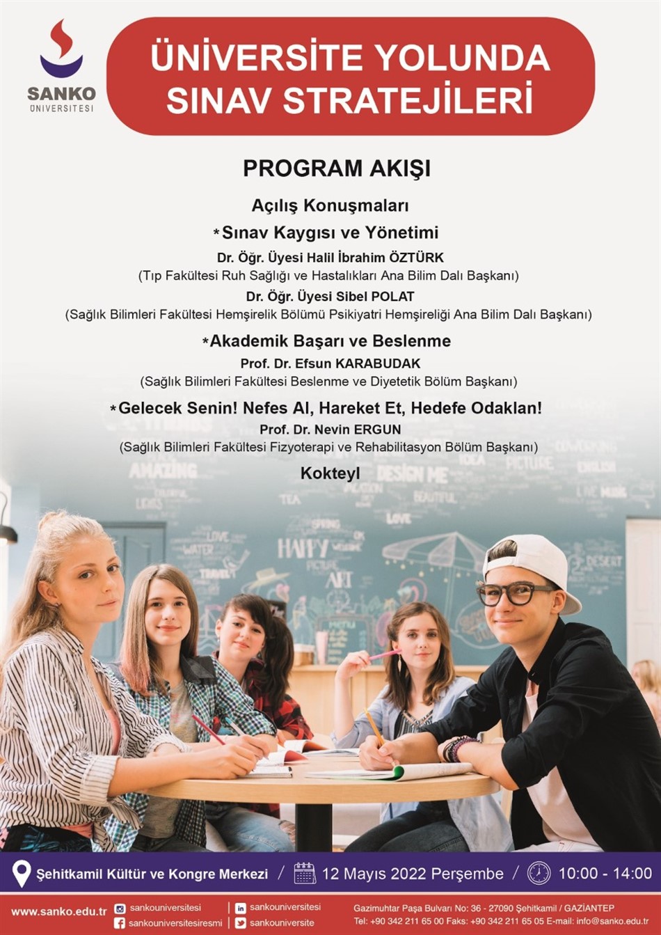 Tıp Fakültesi Ruh Sağlığı ve Hastalıkları Ana Bilim Dalı Başkanı Dr. Öğr. Üyesi Halil İbrahim Öztürk ve Sağlık Bilimleri Fakültesi Hemşirelik Bölümü Psikiyatri Hemşireliği Ana Bilim Dalı Başkanı Dr. Öğr. Üyesi Sibel Polat Olca, “Sınav Kaygısı ve Yönetimi”, Sağlık Bilimleri Fakültesi Beslenme ve Diyetetik Bölüm Başkanı Prof. Dr. Efsun Karabudak, “Akademik Başarı ve Beslenme”, Sağlık Bilimleri Fakültesi Fizyoterapi ve Rehabilitasyon Bölüm Başkanı Prof. Dr. Nevin Ergun ise “Gelecek Senin! Nefes Al, Hareket Et, Hedefe Odaklan!” konularında bilgi paylaşımında bulunacak.