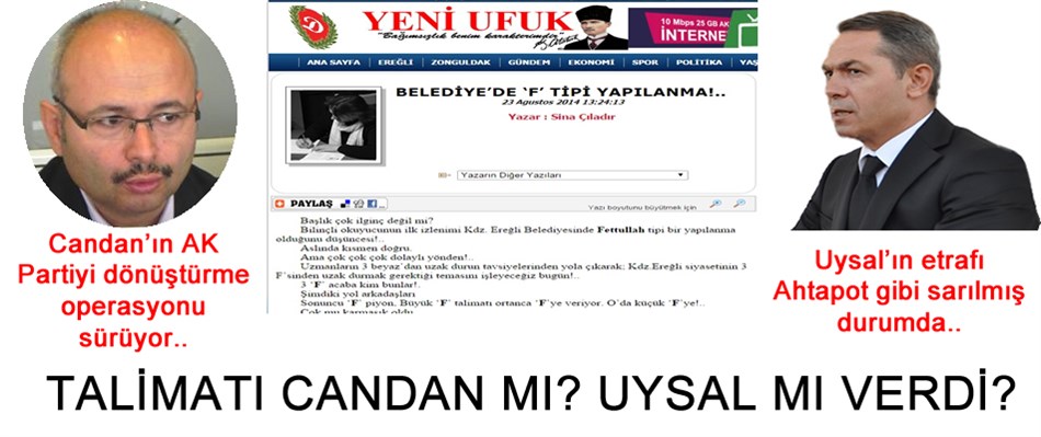 Ereğli Belediyesi kazanıldıktan sonra Ercan Candan’ın talimatıyla Belediye Basın Bürosunda görevlendirilen bir işçi, ‘Belediyede F Tipi yapılanma’ başlığı adı altında, AK Parti’nin Ereğli’deki kurucu kadrolarını hedef alarak bir yazı yayımladı. AK Parti’ye 2 dönem Milletvekili olarak hizmet vermiş Fazlı Erdoğan, İlçe Başkanı Fatih Çakır ve Belediye Meclis Üyesi Fevzi Ekşi ile Haberci’nin Sahibi Bilgin Avcı’yı konu ederek kaleme alınan yazı, Belediye Başkanı Hüseyin Uysal’ın izni olmadan nasıl yayımlandığı merak ediliyor.