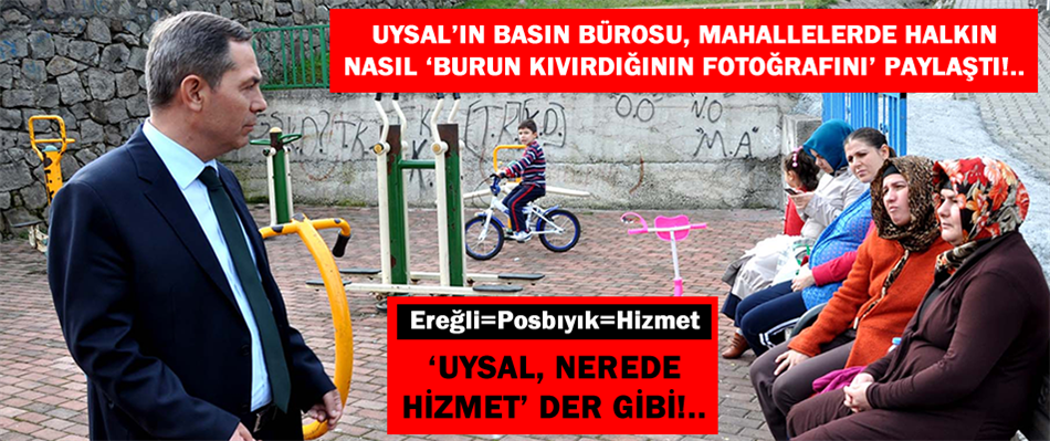 DİP NOT: AK Partili Ereğli Belediyesinin Mahalle gezilerine Basın mensupları davet edilmiyor. Bu nedenle mahalle halkının tepkileri sadece Belediye Basın Bürosunun geçtiği fotoğraflarla algılaşıyor. Bu fotoğrafta, AK Partili Belediye Başkanı Hüseyin Uysal'ın görevdeki 1 yılını Belediye Basın Bürosunun paylaştığı fotoğrafla özetler gibi..Uysal'ın hem mahallelerde, hem de Belediye birimlerinde yapması gereken çok işi var gibi!..